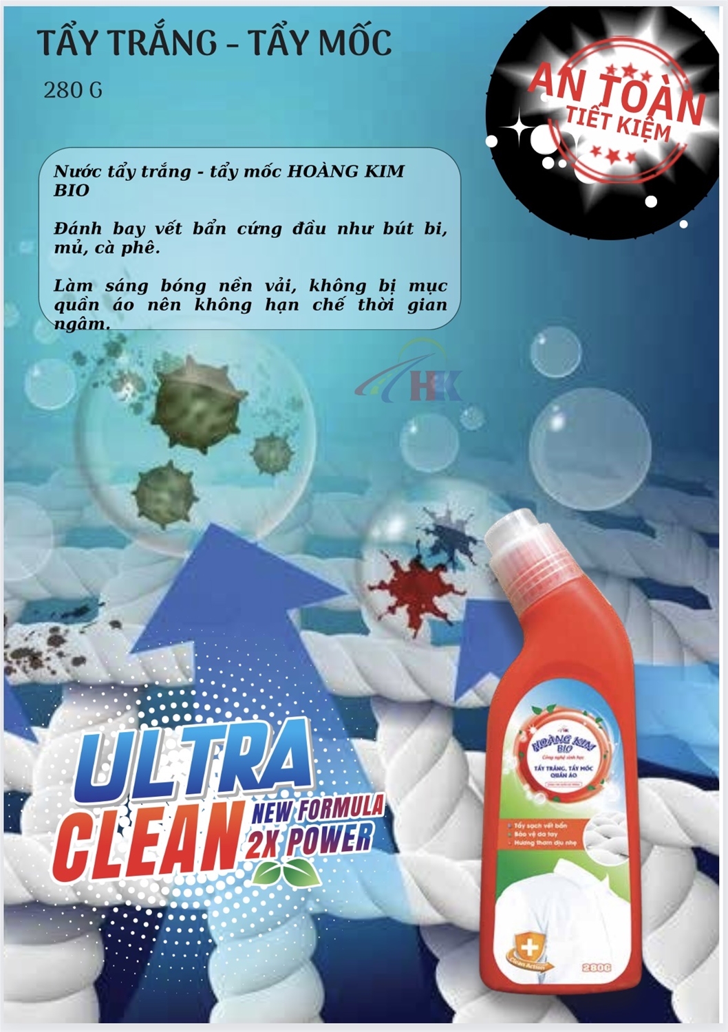 Nước tẩy trắng - tẩy mốc Hoàng Kim Bio đánh bay vết bẩn cứng đầu như bút bi, mủ, cà phê. Làm sáng bóng nền vải, không bị mục quần áo nên không hạn chế thời gian ngâm.