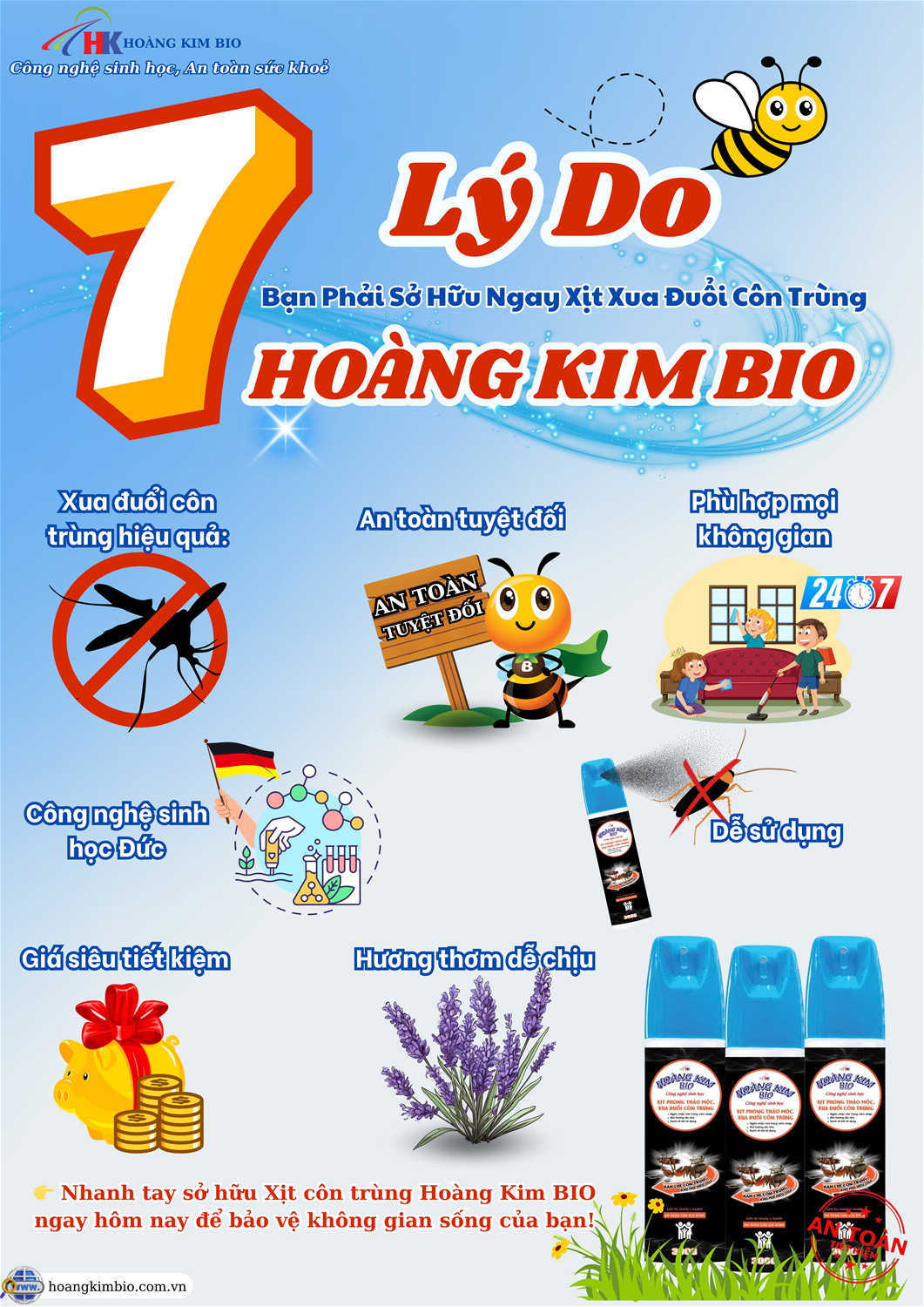 Xịt xua đuổi côn trùng Hoàng Kim Bio là sản phẩm nổi bật của công ty, bảo vệ an toàn và hiệu quả cho cả gia đình khỏi sự xâm nhập của côn trùng.